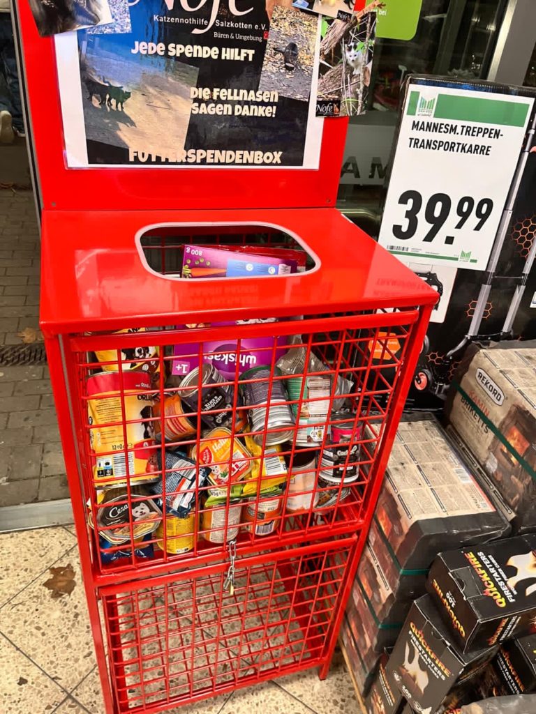 Kundinnen und Kunden haben hier jederzeit die Möglichkeit, Futter, Sachspenden oder andere wichtige Artikel für Tiere in Not zu spenden.